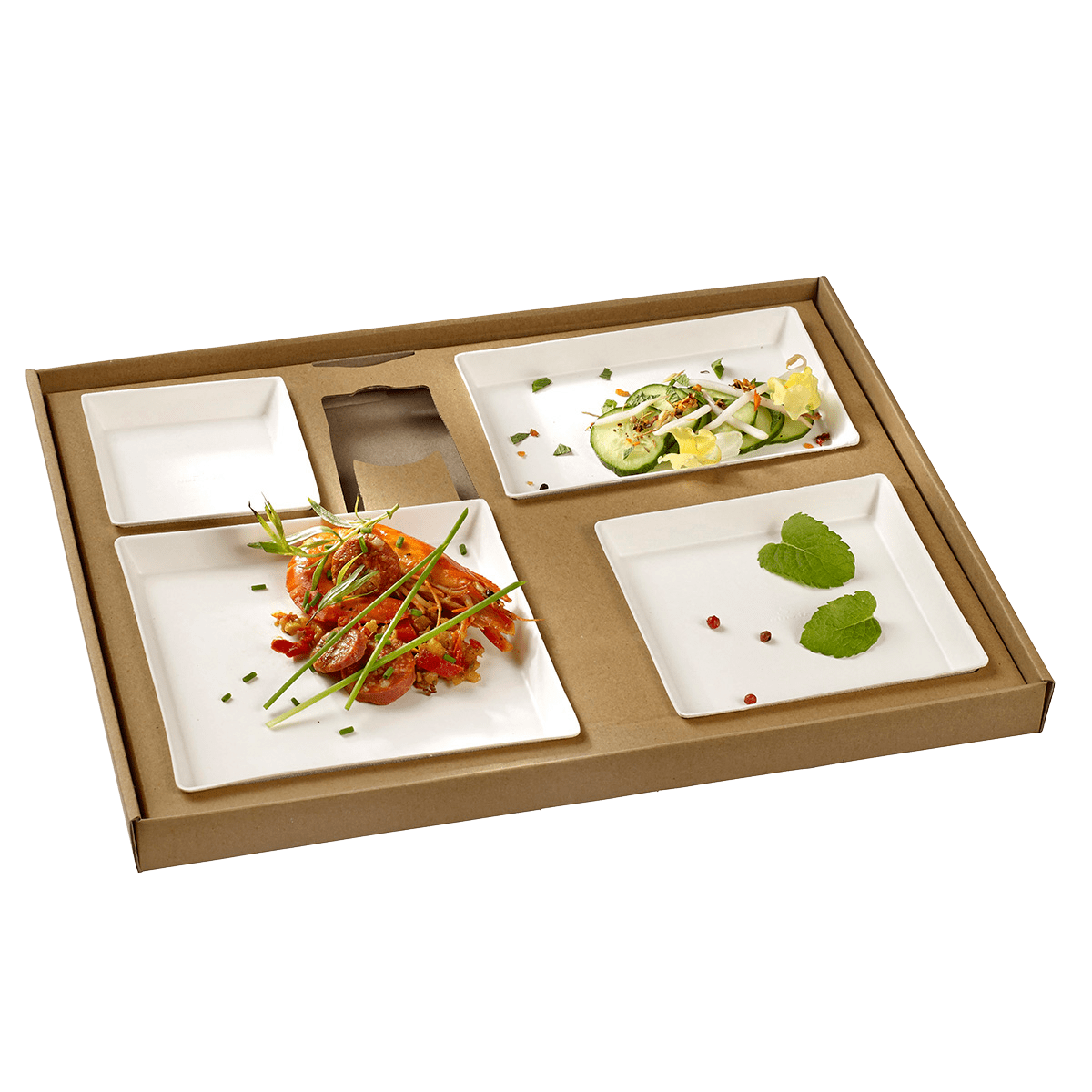 Une base, un calage et un couvercle en carton recyclable composent le kit Ecokraft. Ce coffret-repas est parfait pour le transport et la livraison d'un menu complet. Les assiettes Quartz en pulpe de canne blanche sont dotées d'un couvercle transparent en RPET. Pour une dégustation confortable, elles peuvent aisément être retirées du plateau.