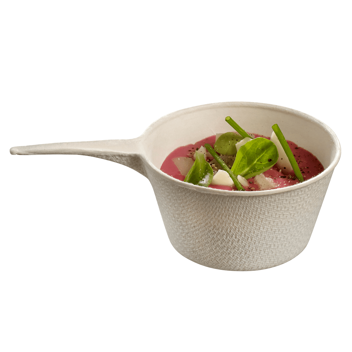 La casserole Eskoffié 50 ml en pulpe de canne avec lamination est un contenant idéal pour présenter des verrines salées lors de buffets.