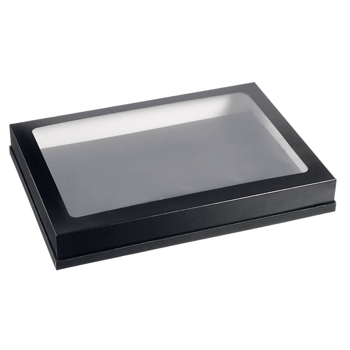 Fabriqué en carton noir de qualité avec une fenêtre en PET, ce couvercle combine protection et visibilité pour vos préparations.