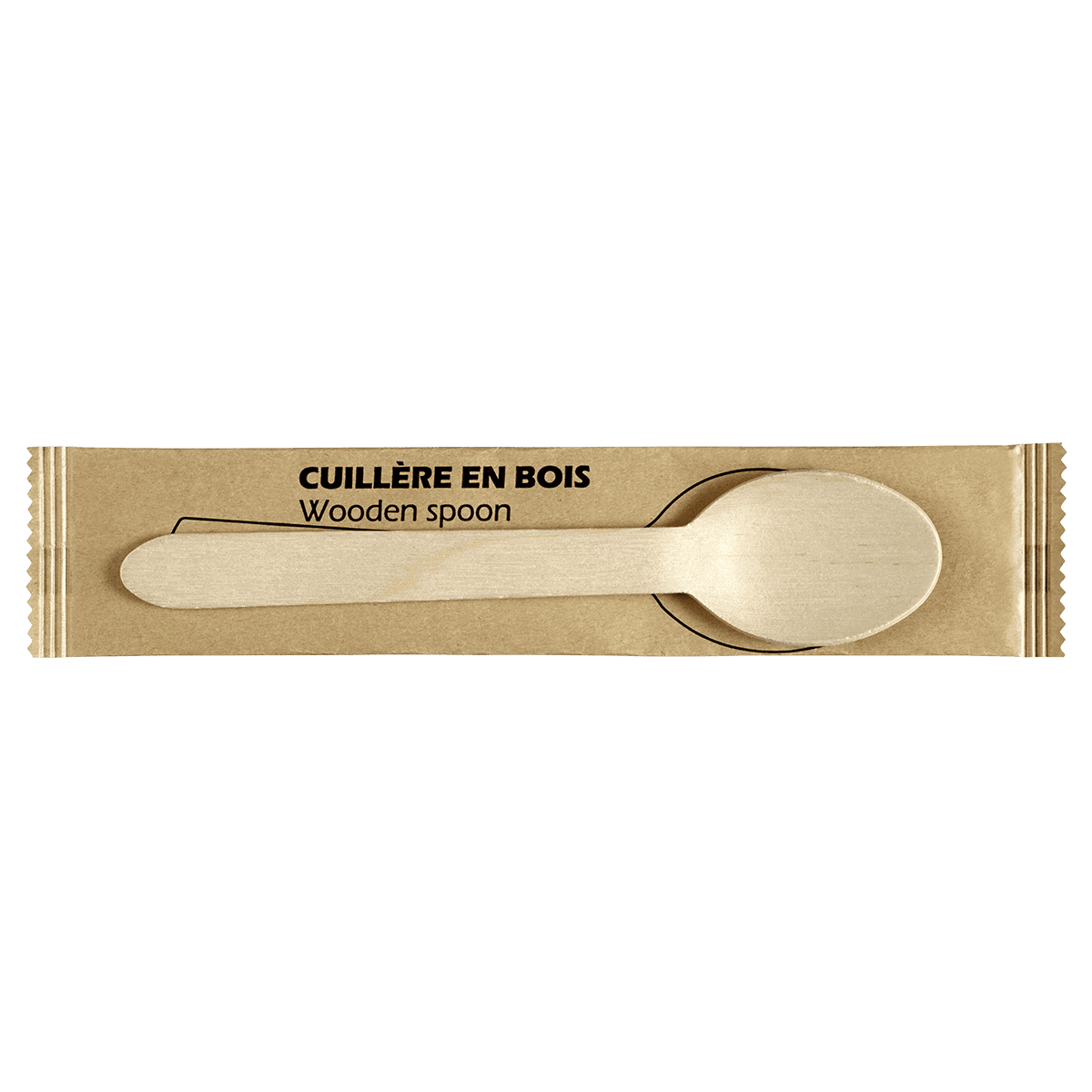 La cuillère en bois 165 mm emballée est l’accessoire parfait pour les repas rapides et les événements à emporter.