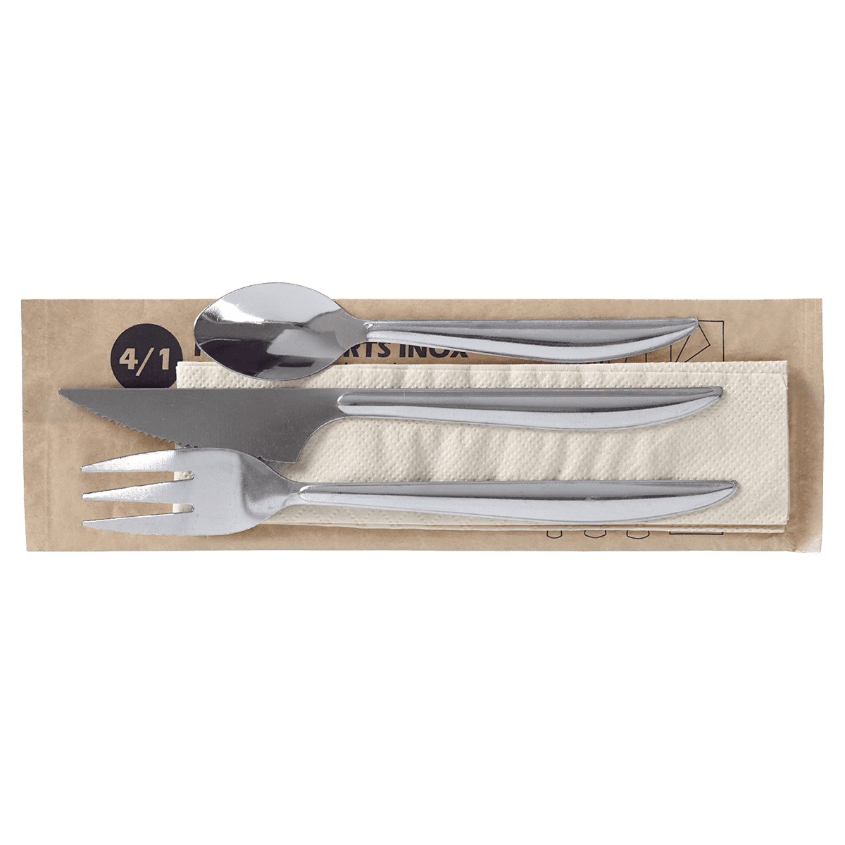 Le Kit Couverts 4-1 Inox Léger comprend une fourchette, un couteau, une cuillère à café en inox léger, ainsi qu’une serviette, parfait pour les prestations à prix réduit.