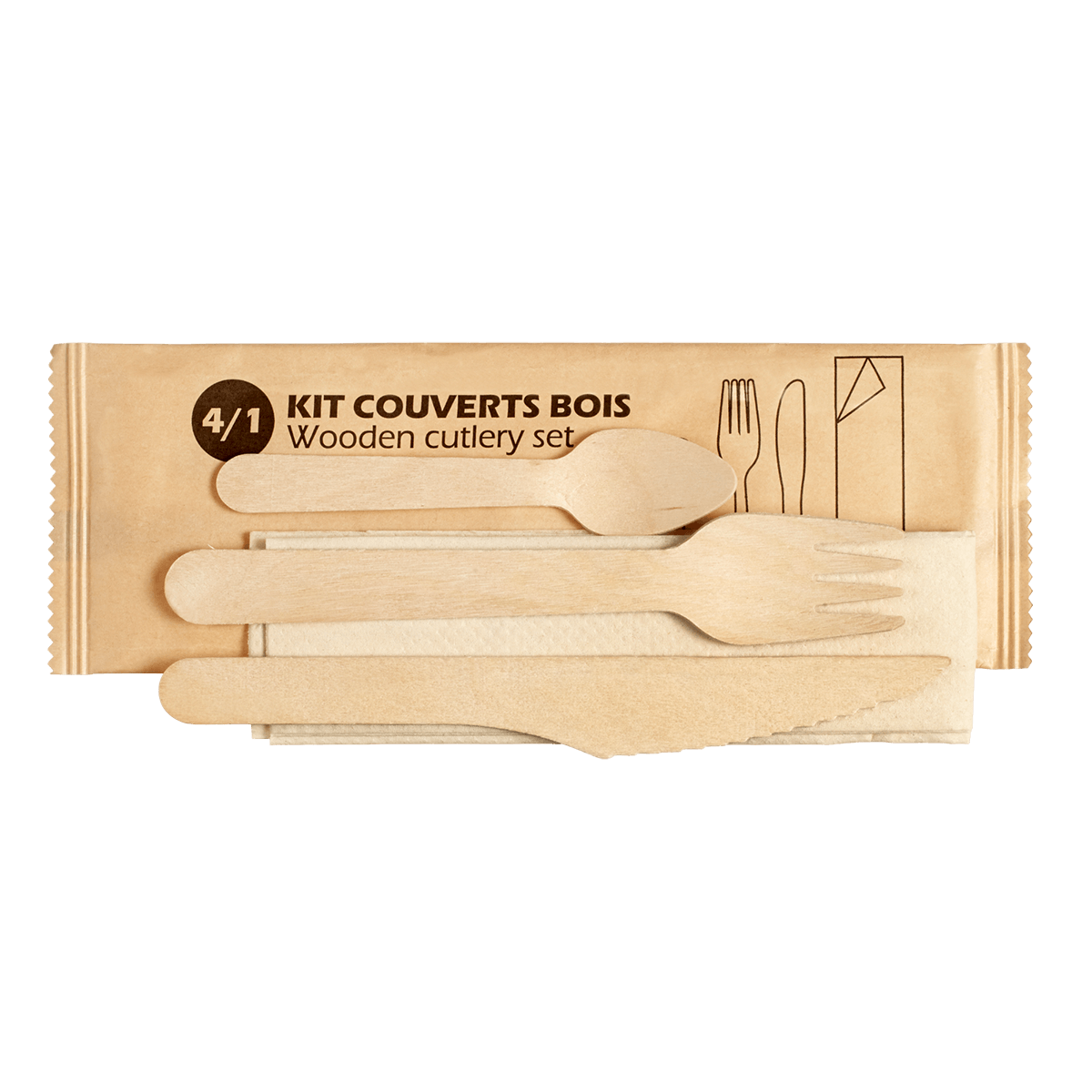 Le kit couverts 4 en 1 en bois avec petite cuillère est une solution complète et pratique pour les repas à emporter ou les événements professionnels. Il contient une fourchette, un couteau, une petite cuillère et une serviette en papier, le tout présenté dans une pochette compacte.