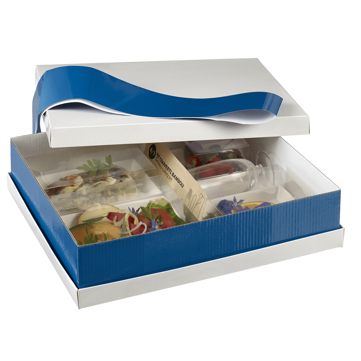Découvrez le kit plateau repas Reverso Solo, conçu pour offrir une solution de service pratique et esthétique. Ce kit se compose d'une base et d'un couvercle blancs, accompagnés d'une rehausse et d'un bandeau bleu. Sa conception astucieuse permet de mettre en valeur vos préparations tout en facilitant leur transport.