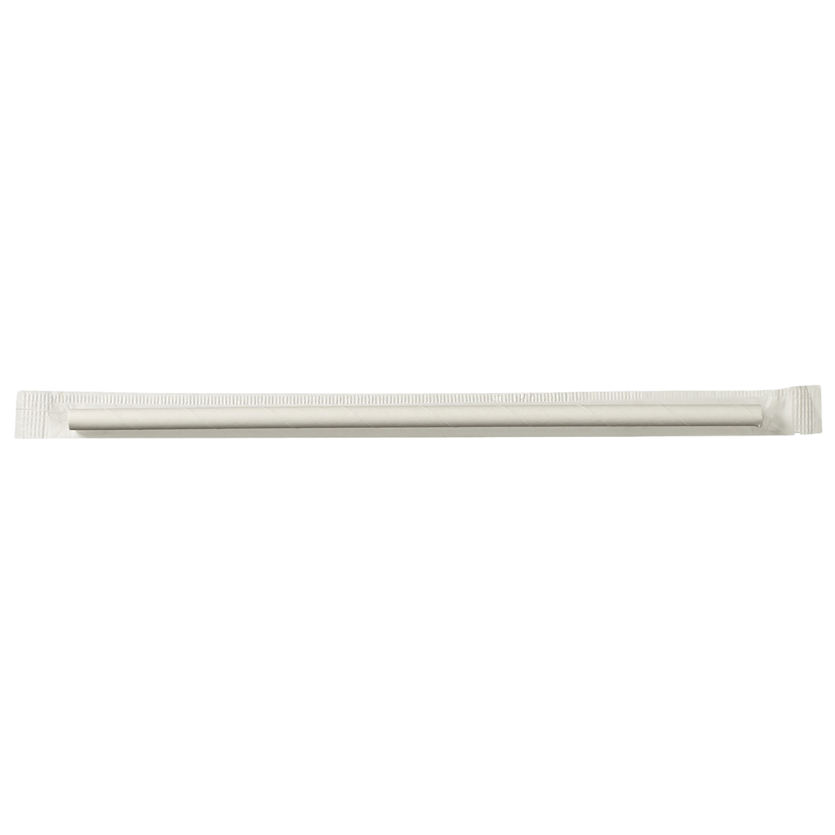 Una cannuccia rigida in carta bianca confezionata singolarmente, perfetta per la degustazione di bevande calde o fredde, da asporto o sul posto.