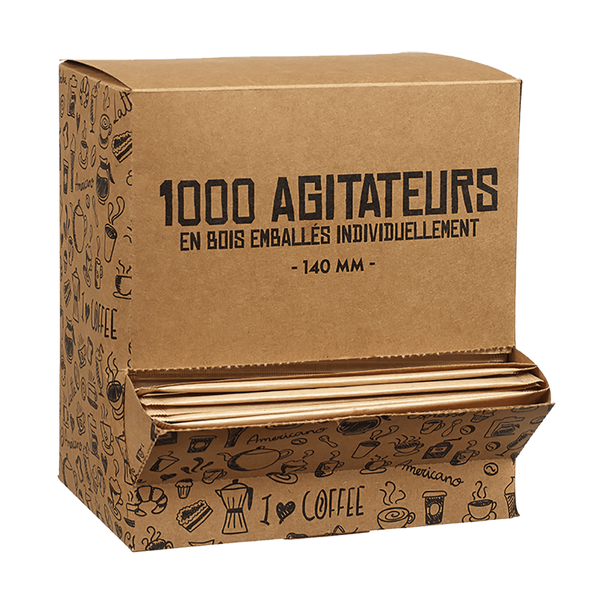 Questi agitatori in legno da 140 mm, confezionati singolarmente e forniti in scatola distributrice, sono perfetti per buffet, mense e catering. Igienici e pronti all’uso, si abbinano perfettamente a caffè e bevande calde.