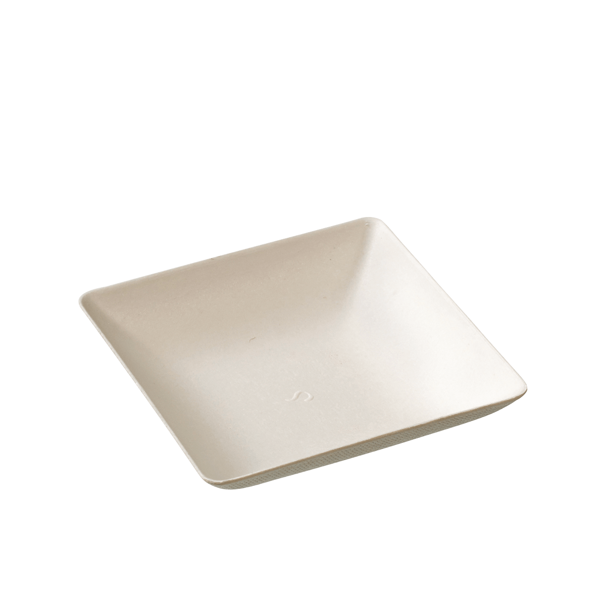Un mini piatto realizzato in polpa di canna, un materiale naturale, rinnovabile e compostabile, associato alle linee pulite della gamma Fluid' (piatti, vassoi, insalatiere sono anche disponibili).