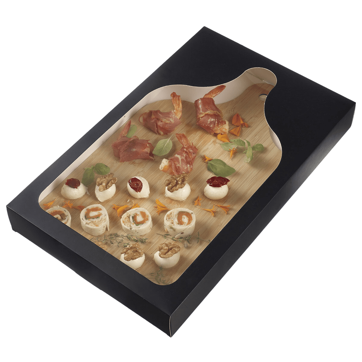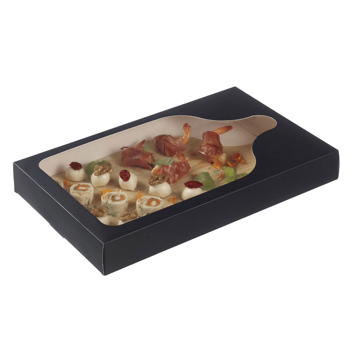 Alleata dei professionisti della ristorazione o dei catering, questa scatola in cartone, progettata con una finestra in plastica, garantisce il corretto trasporto del vassoio di degustazione fino alla sua destinazione, facilitando l'identificazione degli alimenti.