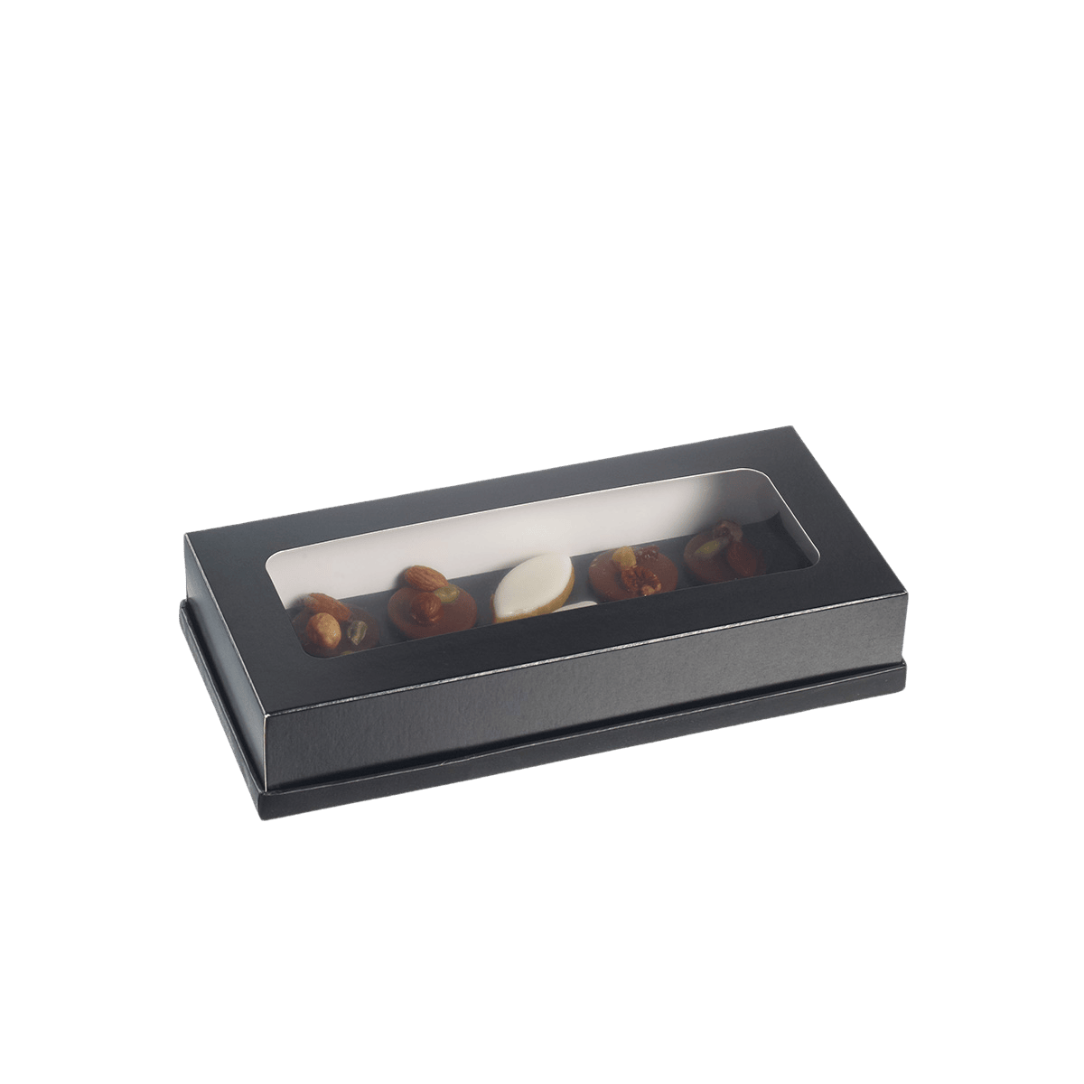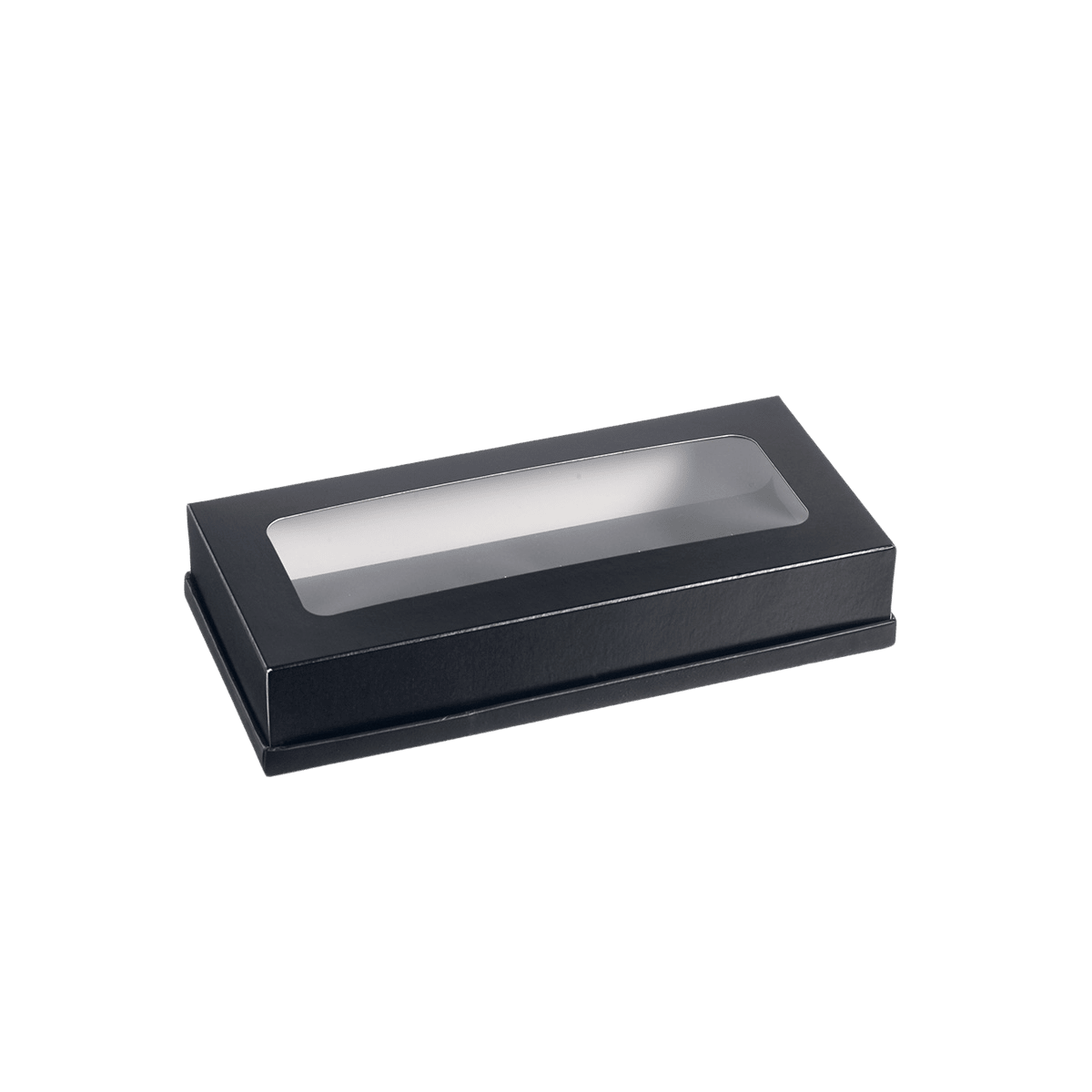Esclusiva Solia, questo modello elegante è realizzato in cartone nero con una finestra in PET, che consente di visualizzare facilmente le tue preparazioni mentre le protegge in modo efficace.