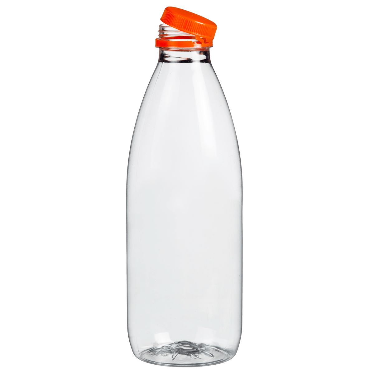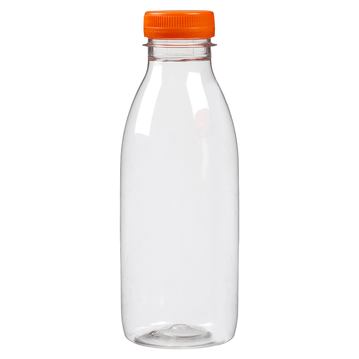 Bottiglie di plastica trasparenti: per bevande durante picnic, viaggi o in ufficio. Tappo ermetico arancione per conservare succhi e smoothie. Disponibili in 250 ml e 500 ml. Materiale: PET, riciclabile. Tolleranza termica: -18°C a +70°C. Uso unico.