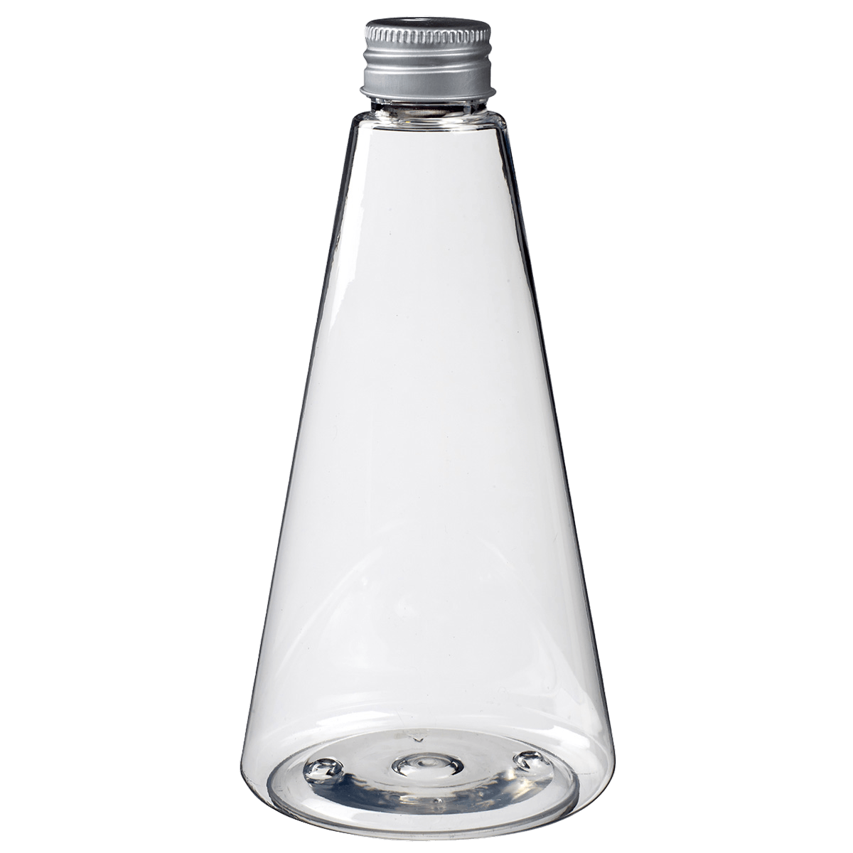 Flacone di plastica trasparente Marie: linee eleganti, capacità di 250 ml, perfetto per cosmetici o bevande. Scegli tra tappo in alluminio CAP25 o a faccette ECLAT25. Tolleranza termica: -18°C a +70°C. Uso unico.