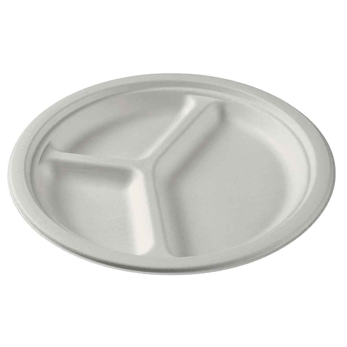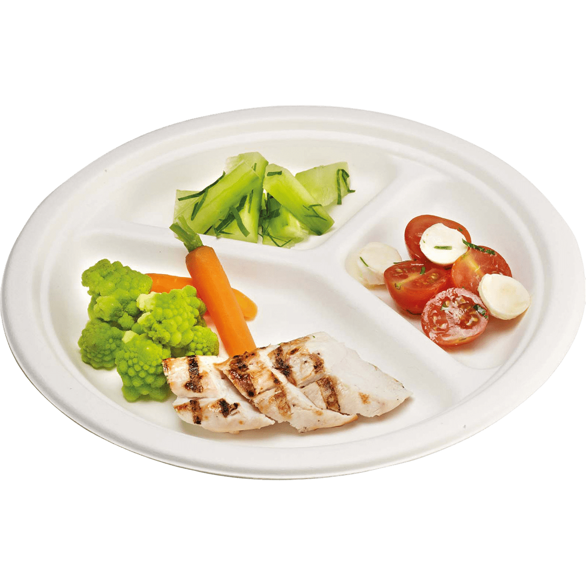 Questo piatto Ø260 mm in polpa di canna è dotato di tre scomparti, ideali per servire più preparazioni senza mescolare i sapori.