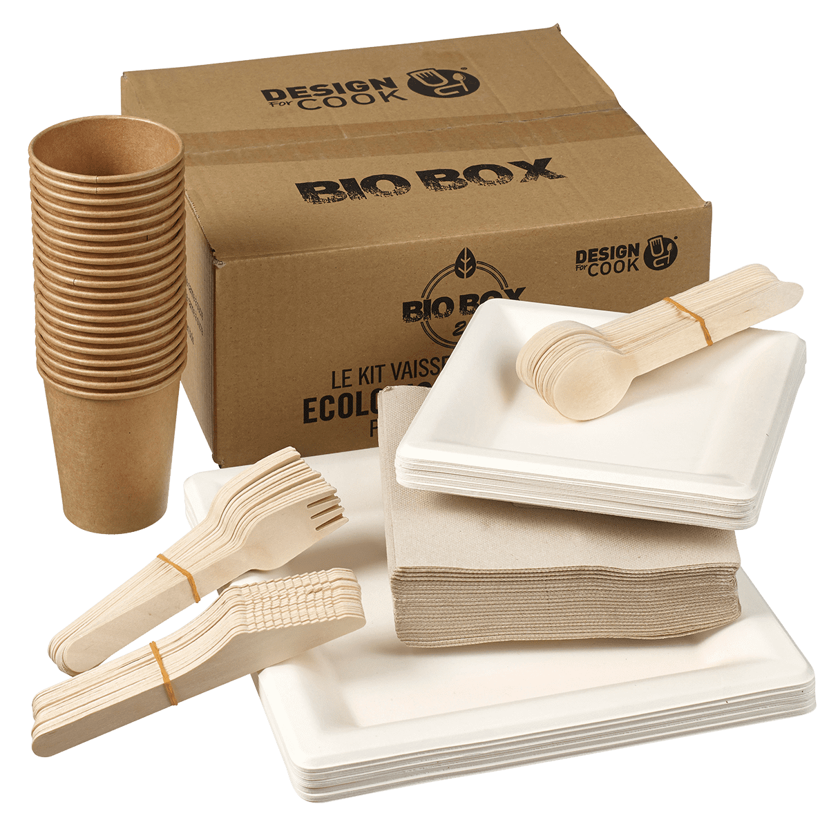 Il kit Biobox per 20 persone è una soluzione ideale per eventi all'aperto o pasti dopo matrimoni. Include piatti, posate e tovaglioli, semplificando così la gestione della stoviglie e offrendo un'esperienza senza problemi per i tuoi ospiti.