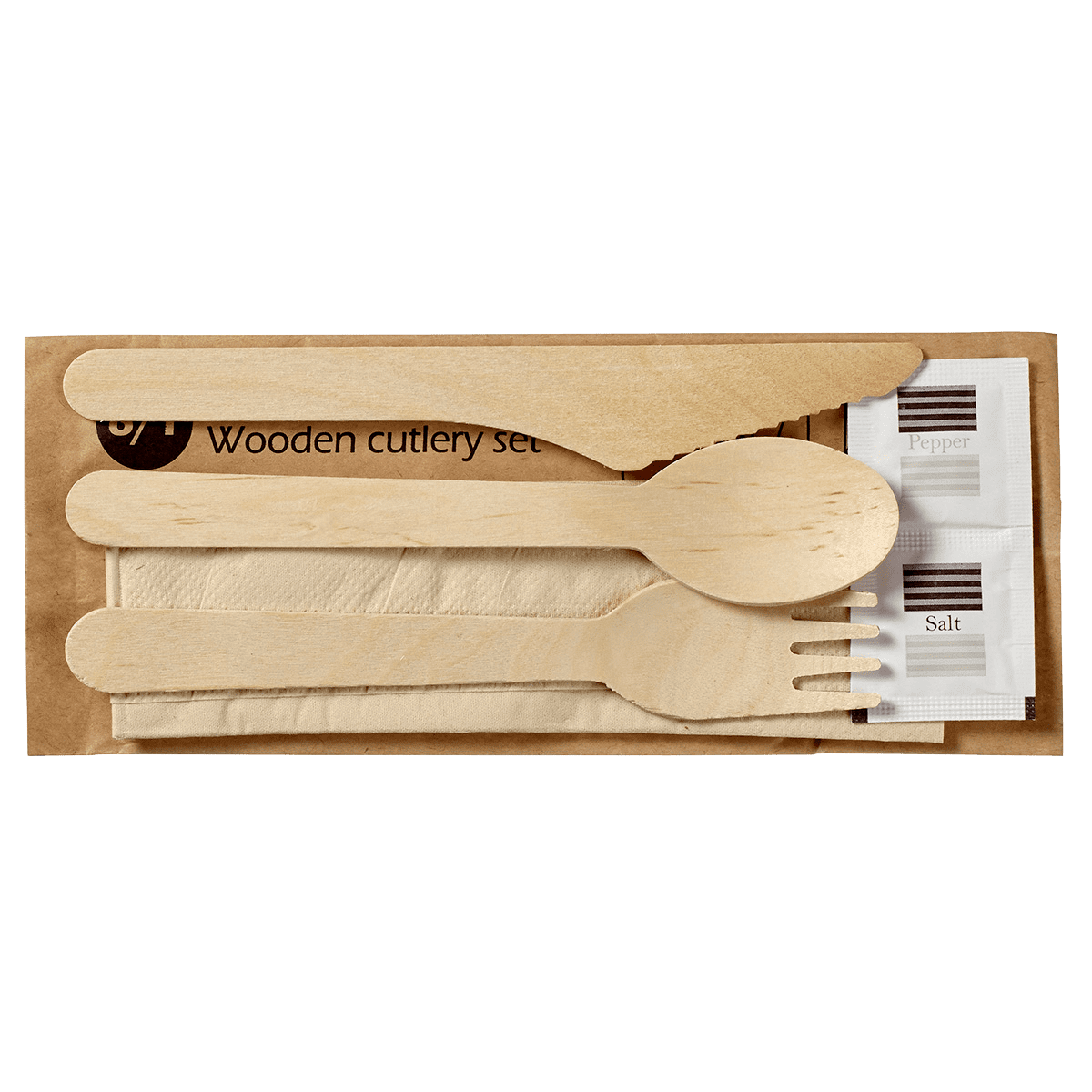 Il kit contiene un cucchiaio, una forchetta, un coltello, insieme a un tovagliolo, sale e pepe, il tutto confezionato insieme per un servizio pratico e veloce. Il legno utilizzato è resistente e conferisce un tocco naturale ai tuoi pasti.