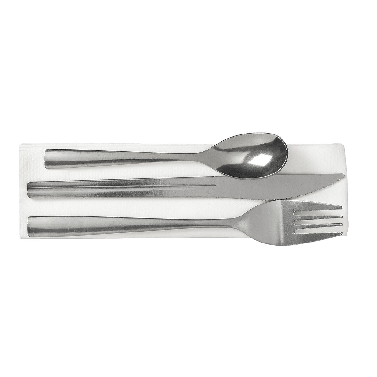 Il Kit Posate 4-1 Econox include un coltello, una forchetta, un cucchiaino e una salvietta bianca, tutto in inox. Perfetto per prestazioni premium, è riutilizzabile e adatto sia per i pasti da asporto che per i servizi a tavola.