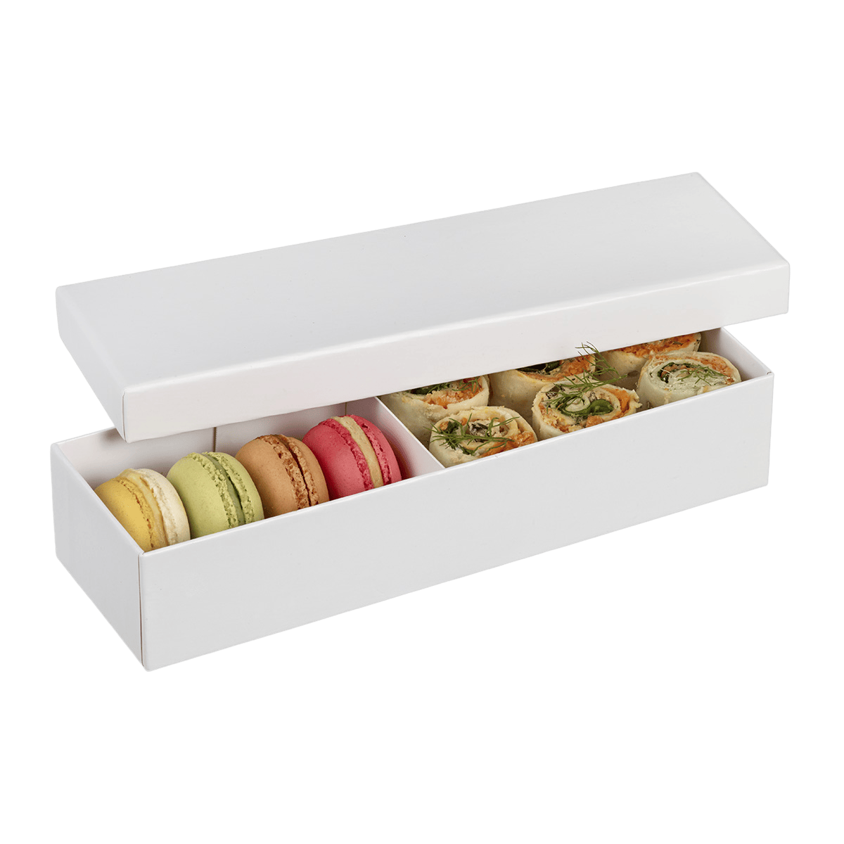 Questa scatola in cartone bianco 245x80x50 mm è una soluzione elegante e pratica, perfetta per catering di alta gamma e pasti di lusso.