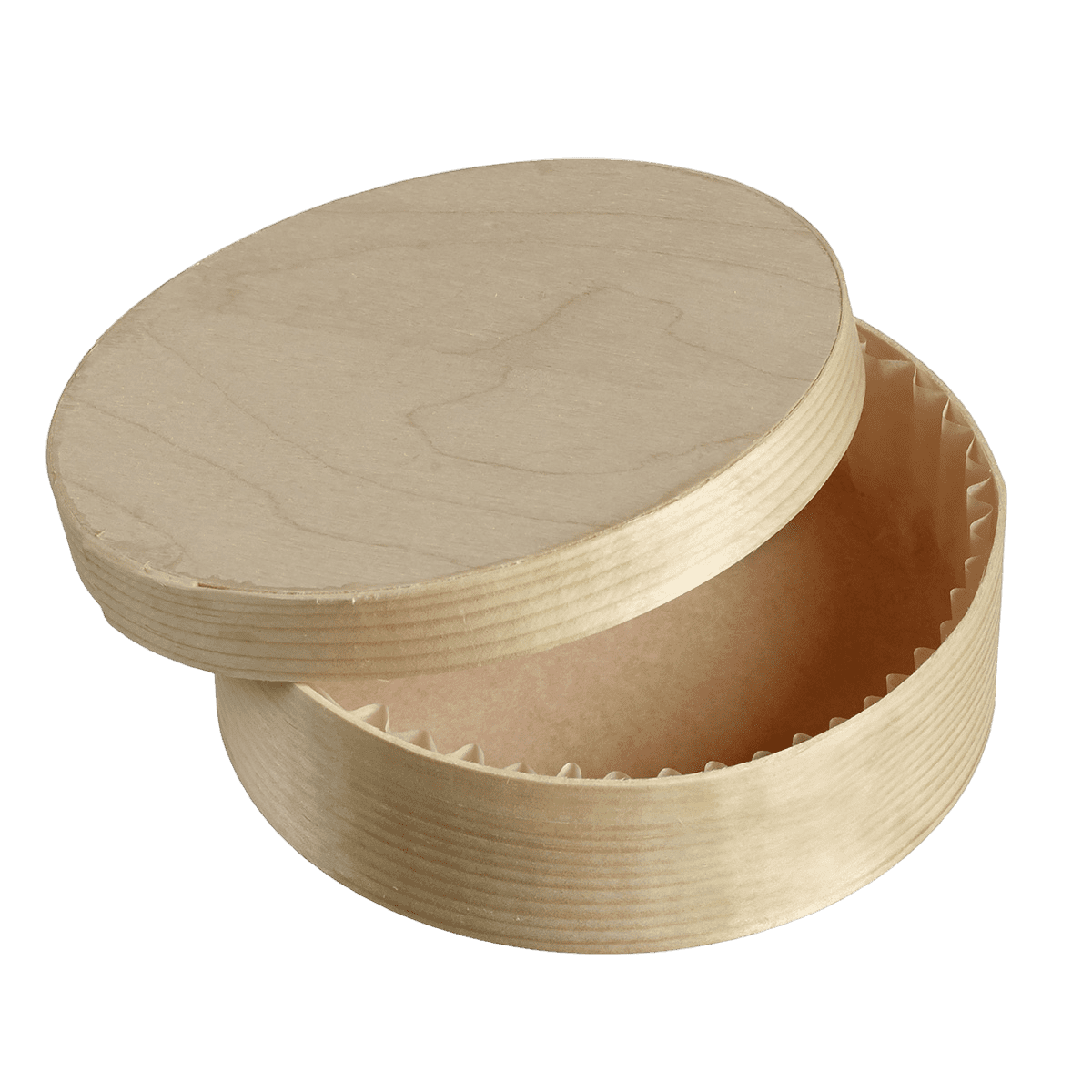 Pratica e naturale, la scatola rotonda Normanda in legno offre una presentazione alla moda e di qualità.