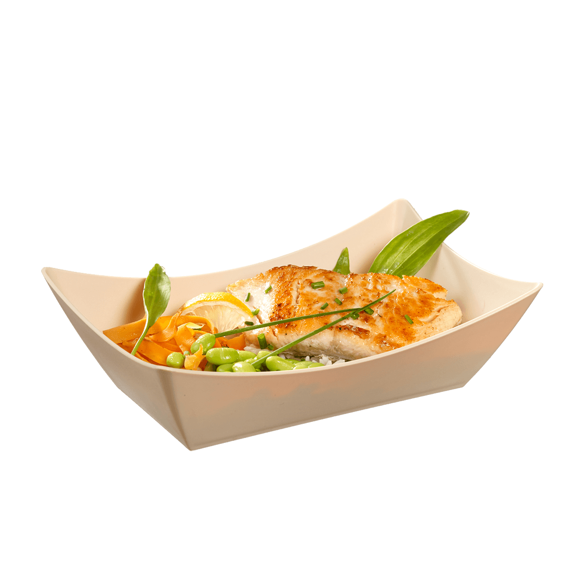 Opta per le nostre barchette Snacking LOOP in plastica PP beige chiaro, una soluzione versatile per la ristorazione professionale.