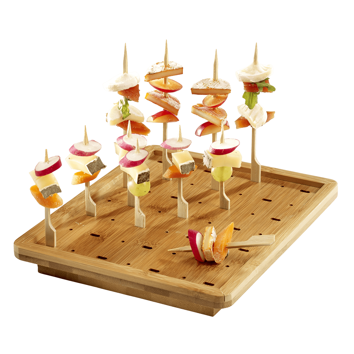 Mettez en valeur vos brochettes apéritives et vos tapas grâce à une planche de présentation pouvant accueillir jusqu'à 25 piques Golf.