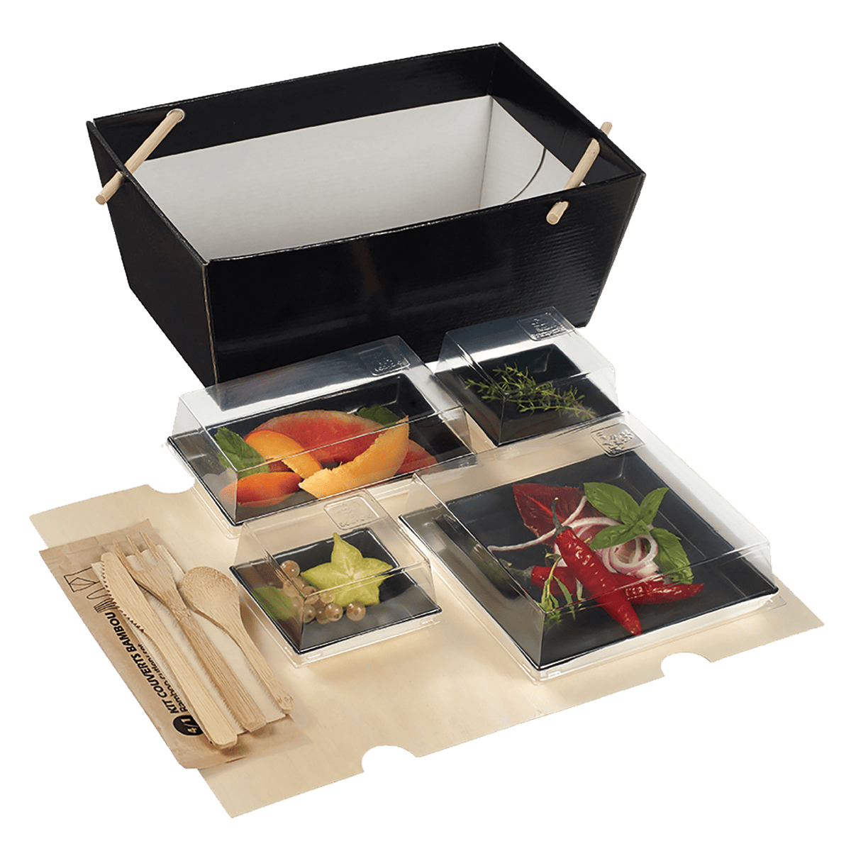 Polyvalente par nature, notre bourriche en carton noir convient parfaitement aux services de livraison, aux ventes à emporter, ainsi qu'à l'exposition en magasin. La Bourriche est le coffret-repas original pour la livraison et la vente à emporter de vos menus.