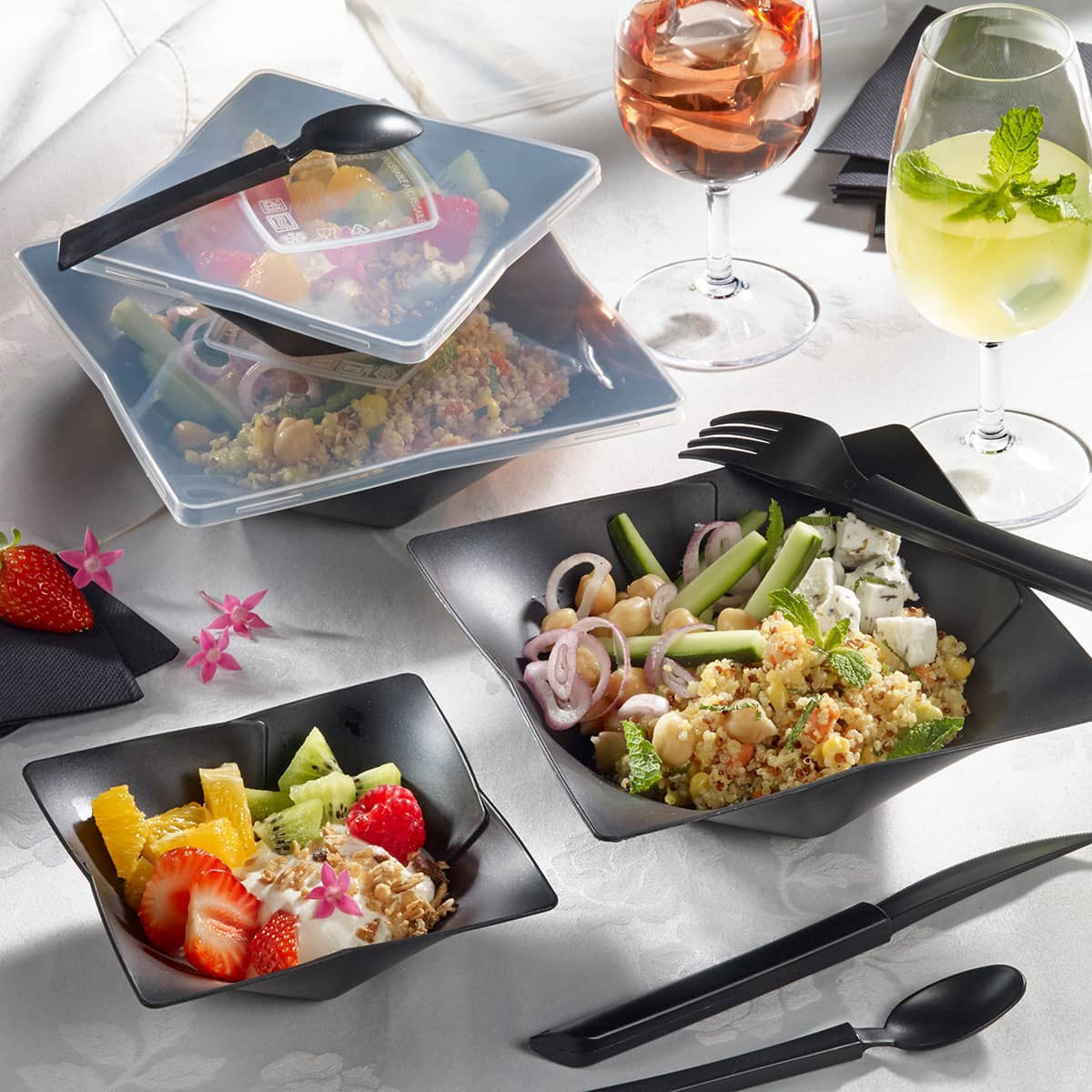 Fabriqué en polypropylène (PP) noir, ce saladier est réutilisable, lavable et compatible avec le micro-ondes.
